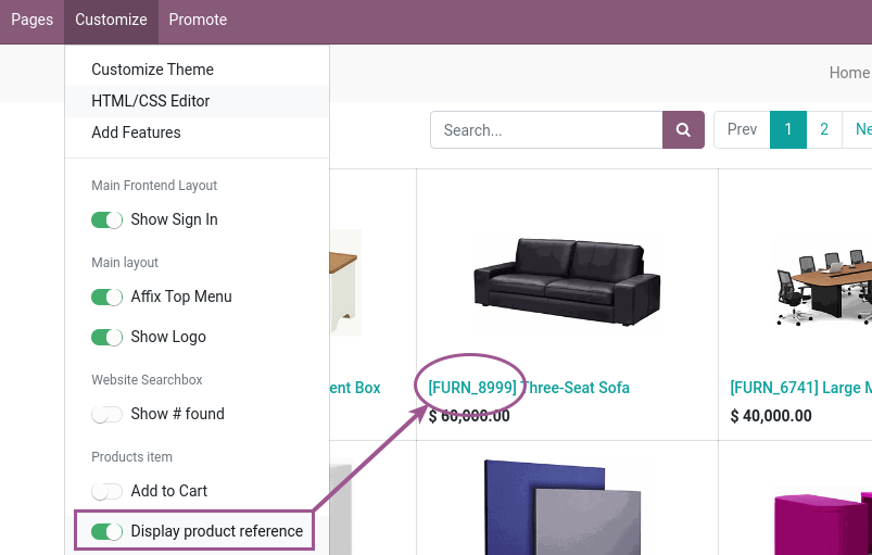 You can enable or disable for each template and website in the Customize frontend menu setting the Display product reference option on or off.