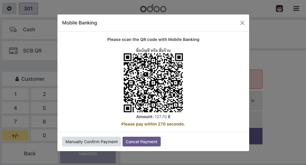The Point of sale QR30 module provides integration with SCB's qr code payment service via Thai QR Code Tag 30 (QR 30). It allows the POS system to validate a customer payment with the callback url from the bank when a customer pays by scanning a QR code with a Thai bank's mobile application.